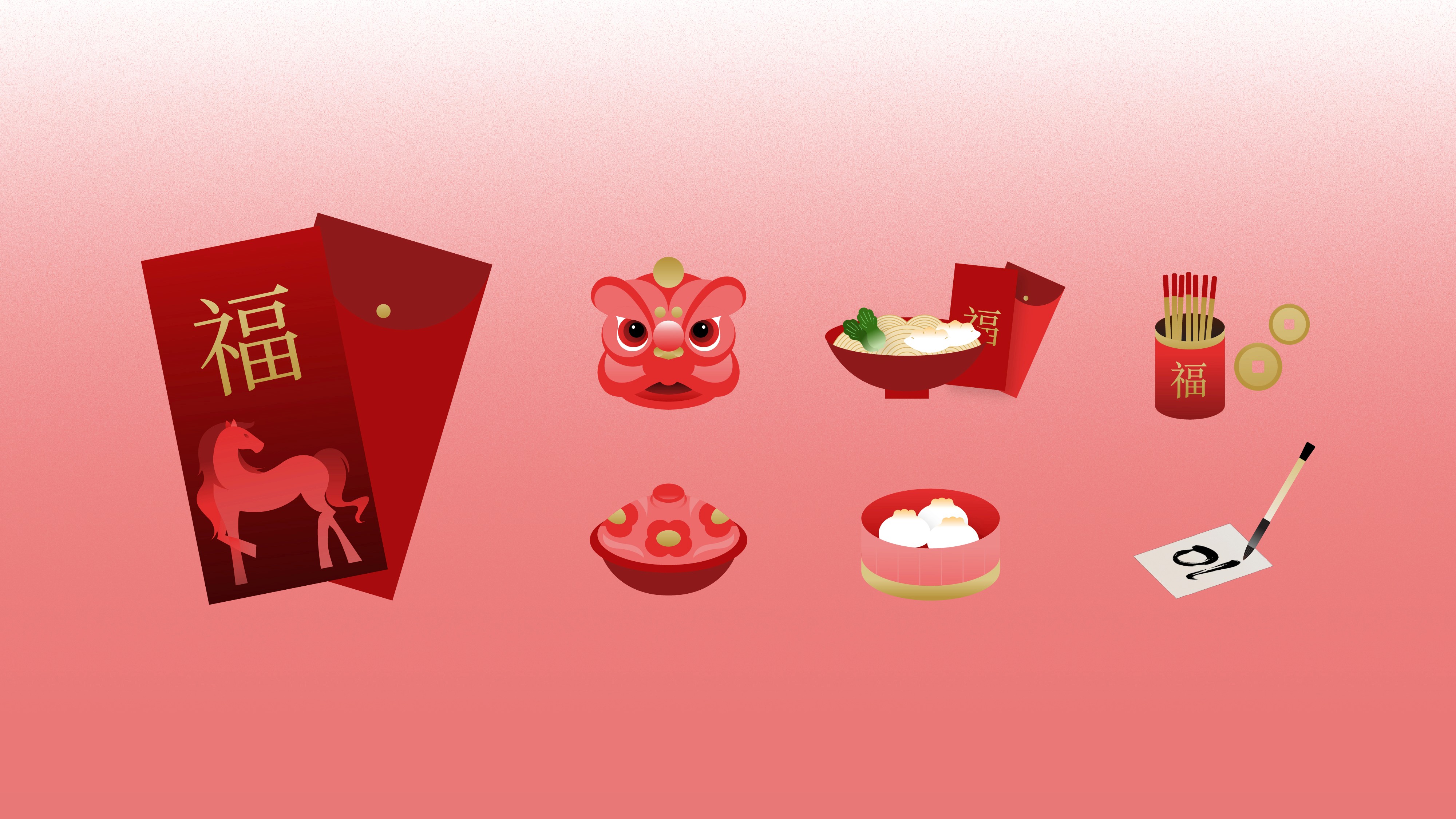 The colour palette features bright red and pink with a soft pink background to tone down the strong energy of the Fire Horse year, while vivid red graphic elements symbolise luck and the spirit of Chinese New Year. The campaign also included a set of custom icon designs for each event for a cohesive visual system.