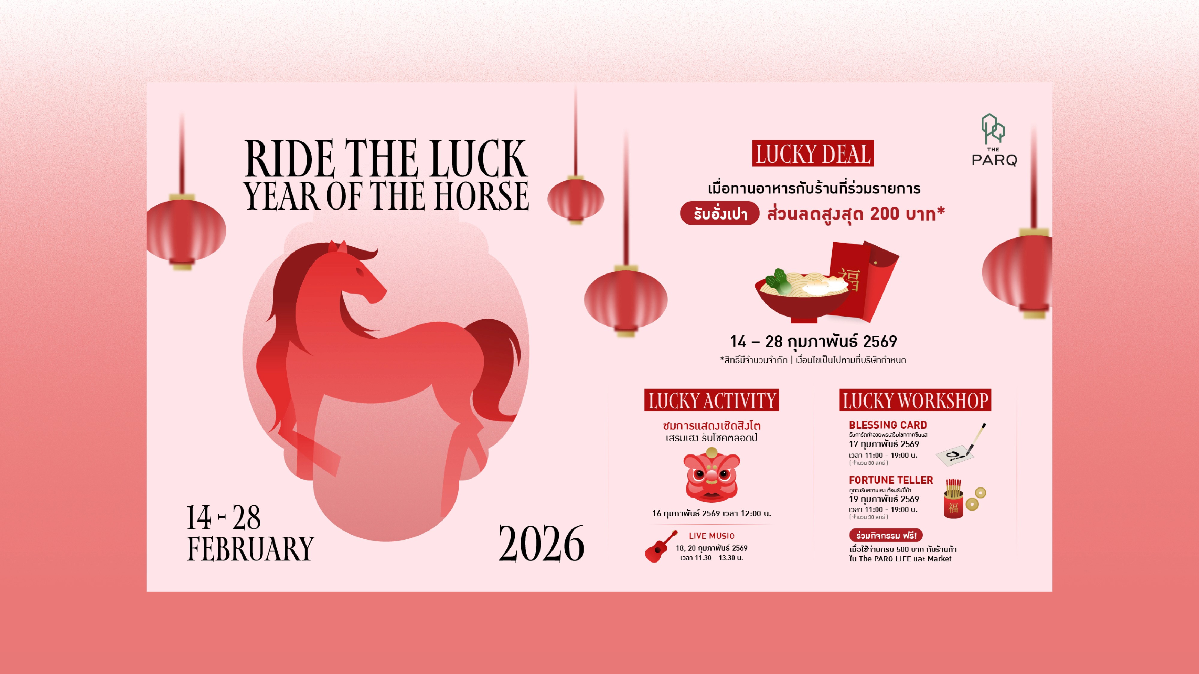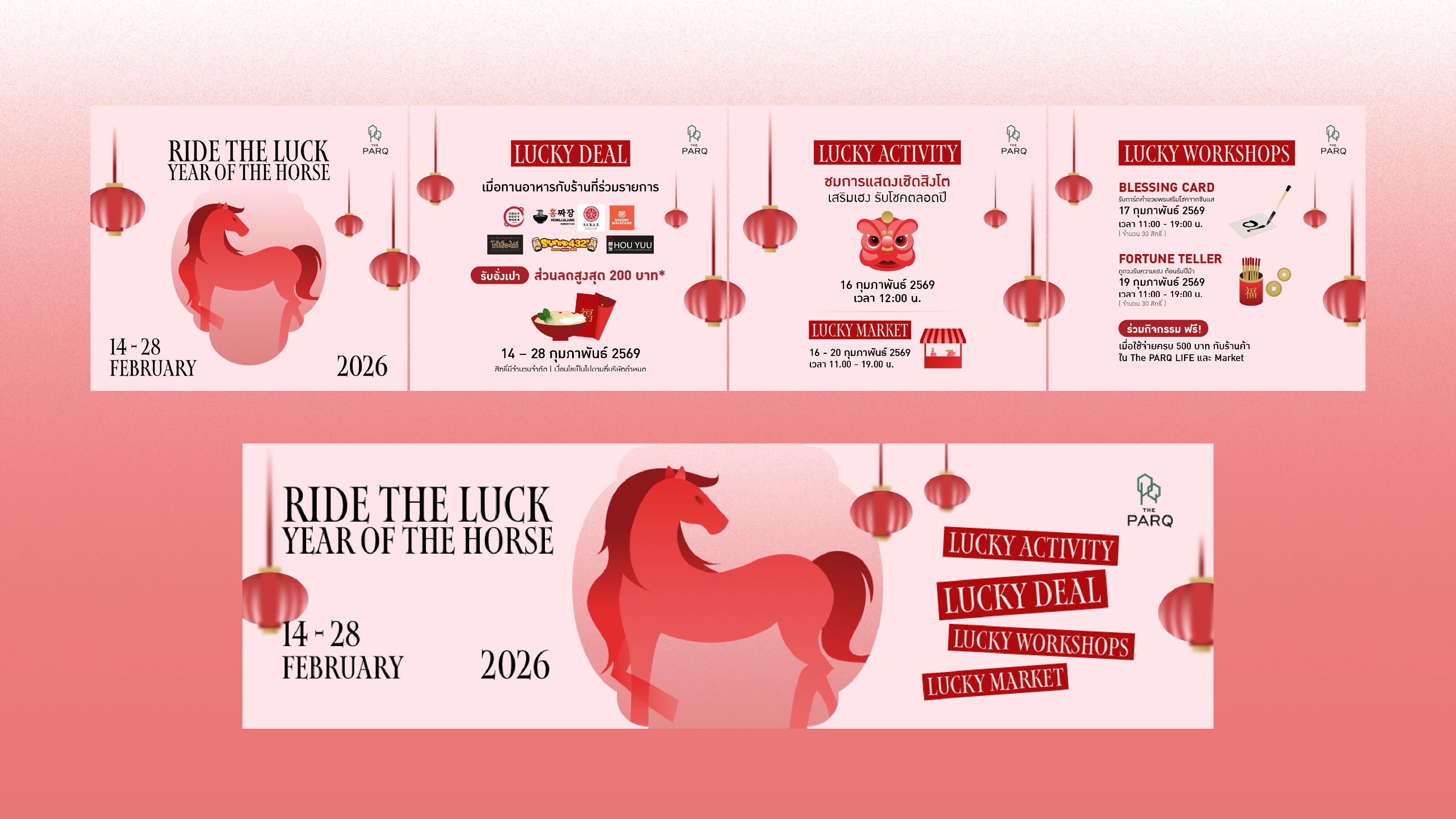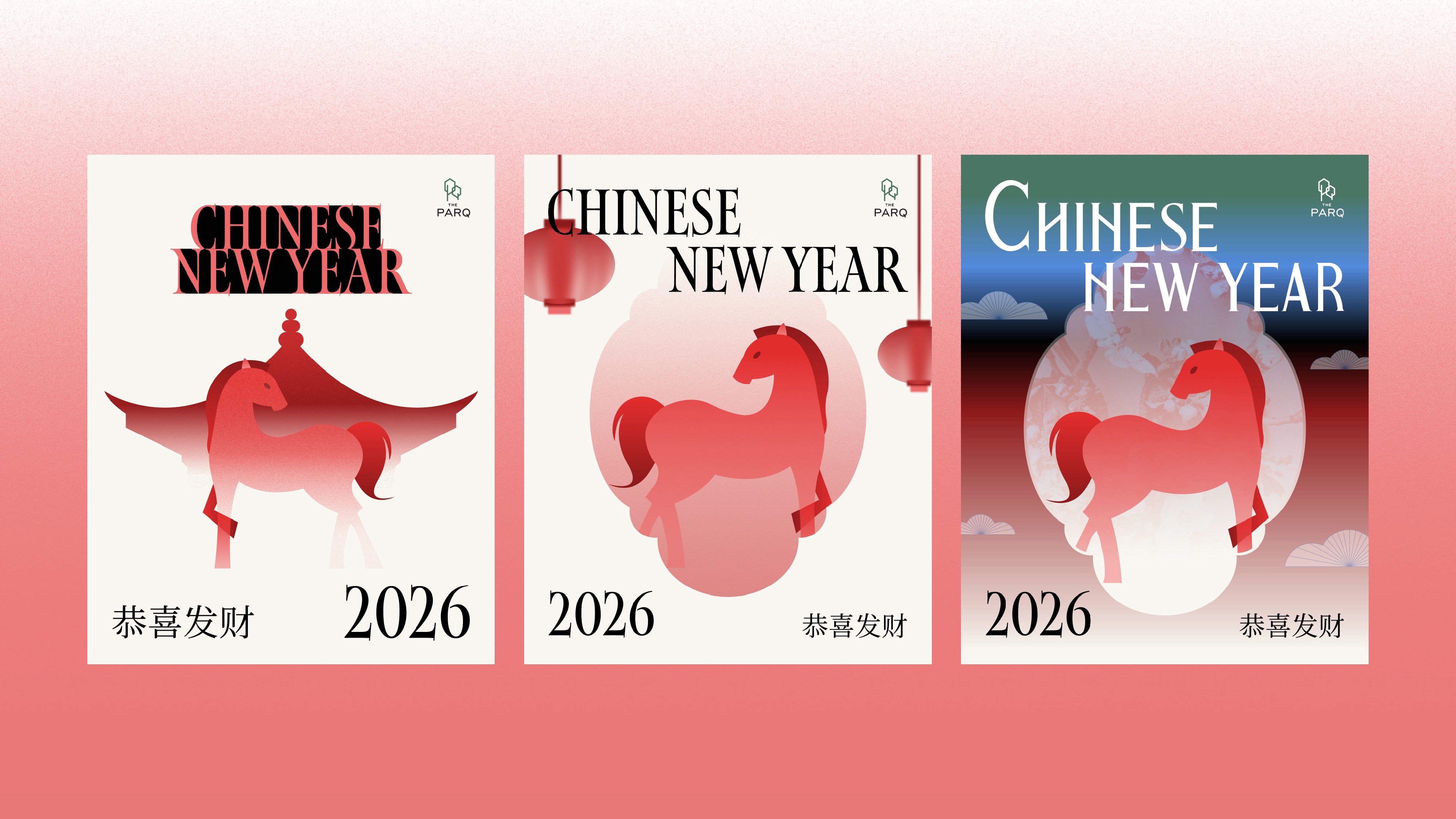 The PARQ Chinese New Year - Ride the Luck: Year of the Horse is a festive seasonal campaign that blends traditional Chinese elements with a modern visual style. The horse is used as the key symbol, representing energy and success while the overall design creates a vibrant atmosphere for the new year.